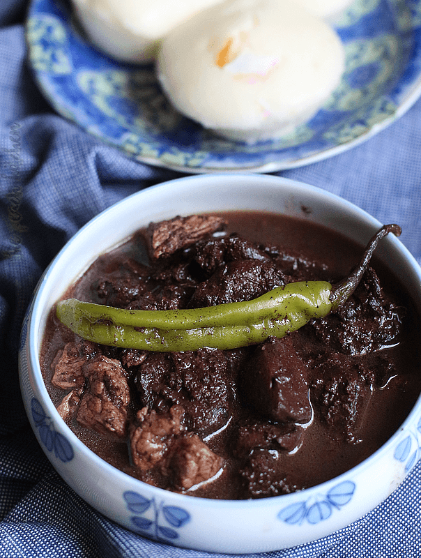 - Add long green peppers and pour pork blood into the pot. Stir. Continue to cook between low to medium heat for 15 minutes while stirring every 3 minutes.